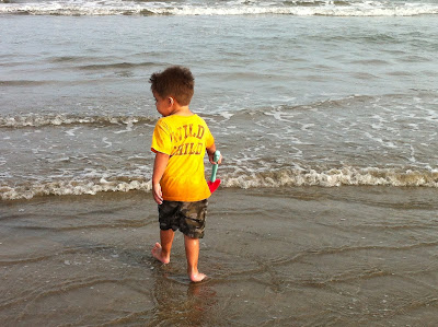 We drove thru McDonalds for breakfast and were on the highway by 9am. I drove until just south of Houston so that Christiaan could sleep some. Mom was on kid entertainment duty in the backseat. We stopped at Bucee's, but otherwise the trip was pretty smooth sailing. Oh, except for just before Bucee's, the passenger side air started blowing hot, like the heater was on, and we couldn't figure out why. Google offered a range of reasons why, but thankfully after sitting in the driveway a few hours it worked again. We made it to the beach house in Sea Isle around 3pm, where our family had already arrived and unpacked. The house was just as perfect as we had thought the pictures looked, and we could see the ocean(aka Gulf of Mexico, but who's counting??)from the porch through the houses across the street. After we unloaded we took the kids to see the water and walk around on the beach before dinner. Carter couldn't help but go crazy in the water, despite being fully clothed, and so after dinner I put his suit on and took him back for a quick swim.